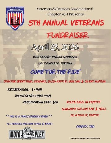 5th Annual Veterans Fundraiser - At High Desert Harley Davidson, 2310 Cinema Drive, Meridian, ID. Registration: 0900-1100 AM